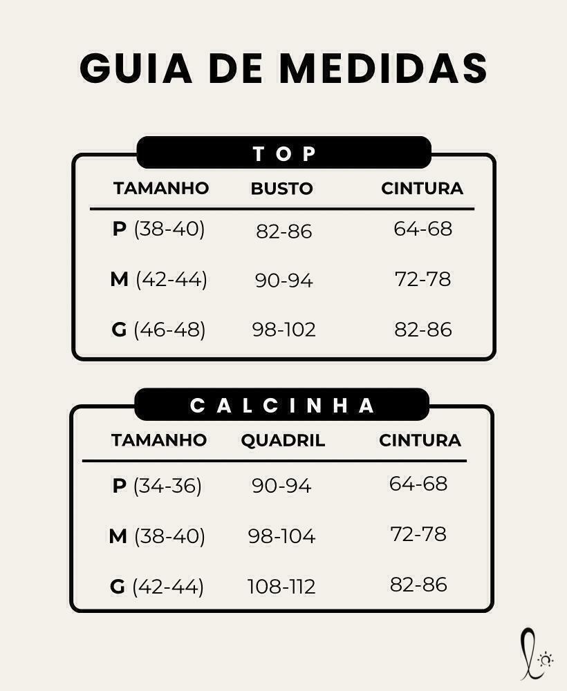 | Tamanho | Top | Calcinha |